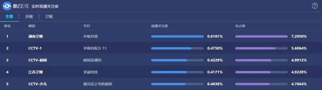 酷云EYE網(wǎng)站可以查看當時全國每個電視臺播放節(jié)目的關(guān)注情況,如下圖所示: