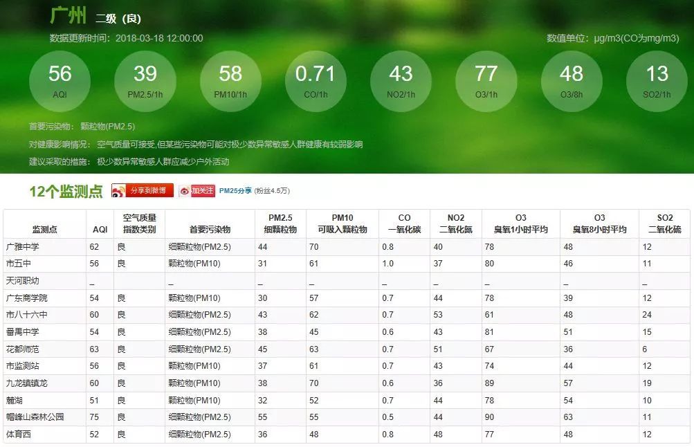PM2.5作為空氣污染的重要指標,在pm25.in網(wǎng)站中,可以查詢到,每個城市的PM2.5值,例如,從首頁進去之后,選擇廣州,即可得到廣州每個監(jiān)測點的PM2.5指標數(shù)據(jù),如下圖所示: