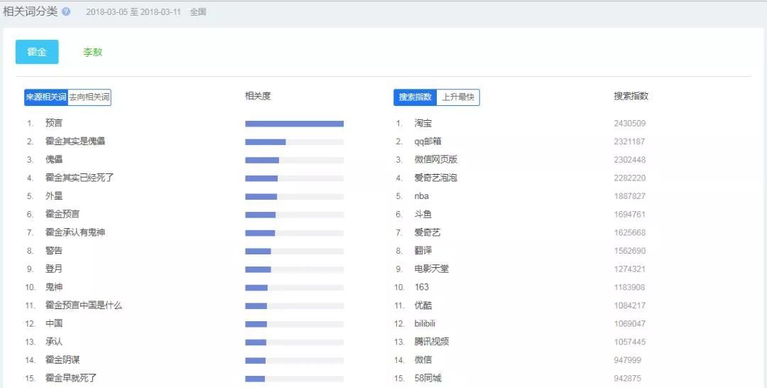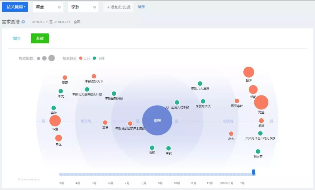 關(guān)聯(lián)數(shù)據(jù)可以通過百度指數(shù)提供的需求圖譜進行查閱,同樣,我們使用霍金和李敖兩個關(guān)鍵字,來查閱他們的需求圖譜是什么。