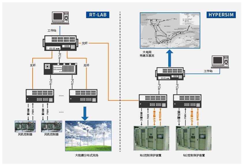 該系統(tǒng)方案結(jié)合了科梁公司RT-LAB及Hypersim兩大旗艦實(shí)時(shí)仿真平臺(tái)的優(yōu)勢,其中借助HyperSim強(qiáng)大的大規(guī)模電力系統(tǒng)仿真能力和優(yōu)勢以仿真?zhèn)鹘y(tǒng)直流及特高壓直流輸電,而借助RT-LAB特有及專業(yè)的電力電子仿真能力模擬大規(guī)模分布式風(fēng)電場,考慮合適的解耦位置,兩者通過高速光纖通訊進(jìn)行自然解耦,從而完成大規(guī)模分布式風(fēng)力發(fā)電經(jīng)直流外送并入大電網(wǎng)場景的精準(zhǔn)而有效的實(shí)時(shí)仿真模擬,開展系統(tǒng)級(jí)的關(guān)鍵技術(shù)問題研究。