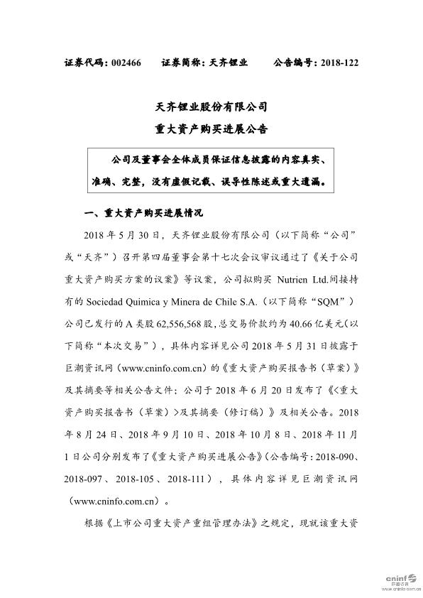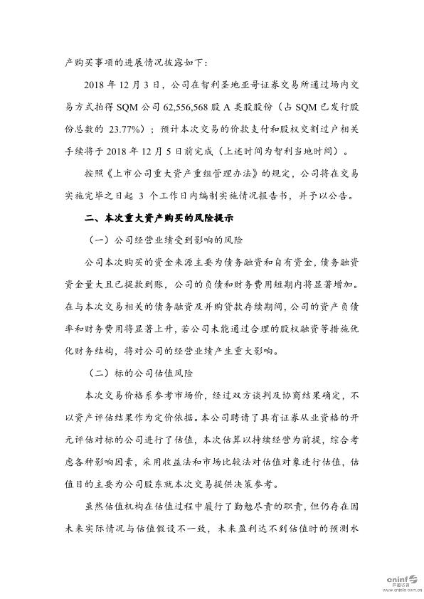 2018年12月3日,天齊鋰業(yè)在智利圣地亞哥證券交易所通過場內(nèi)交易方式以40 66億美元拍得SQM公司 62,556,568 股 A 類股股份(占 SQM 已發(fā)行股份總數(shù)的 23 77%);預(yù)計(jì)本次交易的價(jià)款支付和股權(quán)交割過戶相關(guān)手續(xù)將于 2018 年 12 月 5 日前完成(上述時(shí)間為智利當(dāng)?shù)貢r(shí)間)。