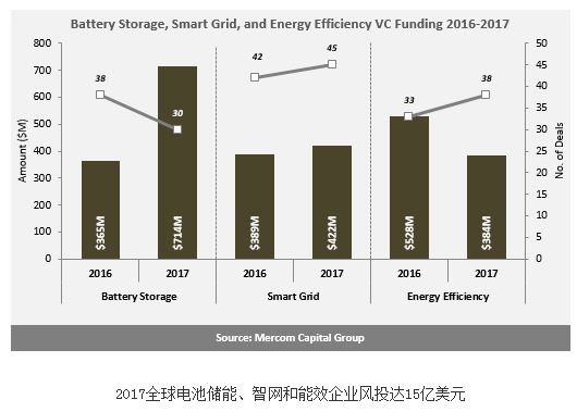 Mercom資本集團日前發(fā)布2017年智能電網(wǎng)、儲能和能效報告稱,2017年全球電池儲能、智網(wǎng)和能效企業(yè)風投資金累計達到15億美元,較之2016年的13億美元上漲15.4%。