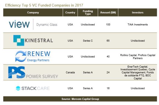 2017年能效領(lǐng)域的風險投資資金從去年的5.28億美元跌至3.84億美元,涉及交易38個。包括債務(wù)和公共市場融資在內(nèi)的企業(yè)融資總額為33億美元,而2016年則為38億美元。
