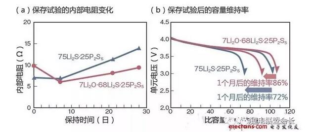 豐田確認(rèn),作為全固體電池的固體電解質(zhì),具備高耐水性的75Li2S˙25P2S5在60℃的保存試驗(yàn)中,內(nèi)部抵抗難以上升(a)。試制充電電池測量容量變化時(shí)發(fā)現(xiàn),1個(gè)月后保持了86%的容量(b)。(圖由《日經(jīng)電子》根據(jù)豐田的資料制作)