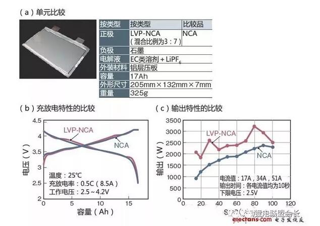 富士重工業(yè)采用將LVP與NCA按重量比3:7混合的正極試制了17Ah的層壓型單元(圖16)。能量密度為190Wh/kg(373Wh/L),平均電壓為3.64V,與僅采用NCA正極試制的單元具備基本相同的性能,同時(shí)大幅提高了輸出特性。SOC較低時(shí)的輸出特性尤為出色。富士重工業(yè)表示,通過改變混合比例,有望達(dá)到期望的輸出特性。
