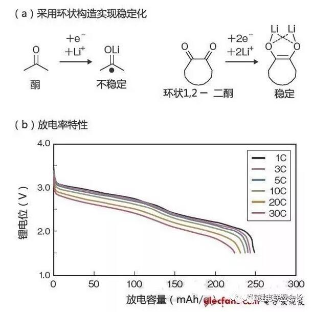 京都大學(xué)和松下開發(fā)出了正極材料采用將兩個(gè)酮連接形成環(huán)狀構(gòu)造的環(huán)狀1,2-二酮的有機(jī)充電電池(a)。支持30C的高速充放電(b)。