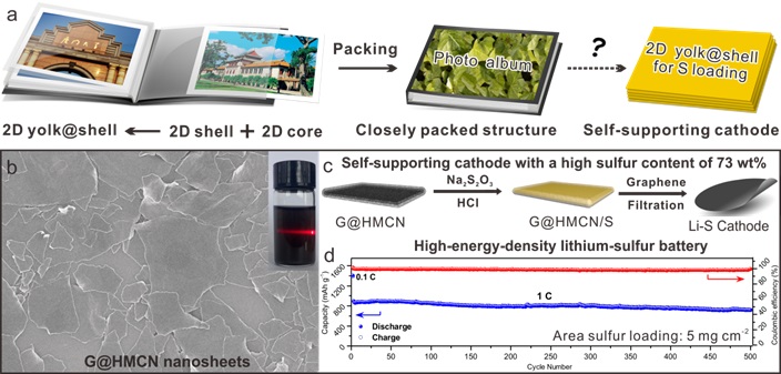 受到老式相冊緊密堆積結(jié)構(gòu)的啟發(fā),該研究團隊提出一種新型二維“蛋黃-殼”結(jié)構(gòu),合成石墨烯包裹于中空多孔碳納米片的內(nèi)部腔體中(簡稱G@HMCN),以構(gòu)建不使用金屬集流體和粘結(jié)劑的自支撐型鋰硫正極薄膜材料。由于具有高比表面積和孔容、豐富的氮原子摻雜和良好的分散性,G@HMCN能夠制備載硫量高達80.5 wt%的碳硫復(fù)合物(簡稱G@HMCN/S)。通過簡單的真空抽濾法,G@HMCN/S和商品化的石墨烯可以共組裝形成自支撐、柔性且緊密堆積的復(fù)合薄膜(簡稱G@HMCN/S-G)。該復(fù)合膜的載硫量為73 wt%,面積載硫量可達5~10 mg cm-2。受益于獨特的緊密堆積結(jié)構(gòu),面積載硫量為5 mg cm-2的G@HMCN/S-G作為Li-S電池正極,在5C(1C=1675 mA g-1)倍率下充放電的可逆容量高達524 mAh g-1;在1 C倍率下500次循環(huán)后可逆容量仍可保持719 mAh g-1;可以兼顧高面積容量(5.7 mAh cm-2)與高體積容量(1330 mAh cm-3)。更為突出的是,面積載硫量為10 mg cm-2的G@HMCN/S-G的面積容量與體積容量分別可達11.4 mAh cm-2和1329 mAh cm-3。該研究工作不僅為發(fā)展高能量密度Li-S電池提供了新的機遇,同時也衍生了一類新型的二維碳納米材料,有望應(yīng)用于其它眾多研究領(lǐng)域,如超級電容器、異相催化和電催化、柔性儲能器件。