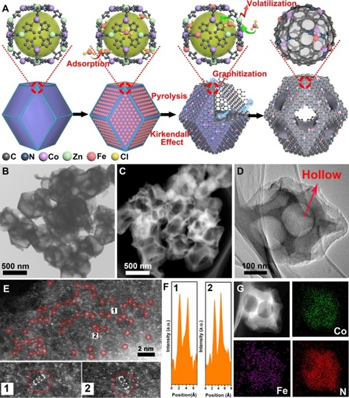 吳宇恩教授課題組,以鋅鈷雙金屬M(fèi)OF作為前驅(qū)體,通過雙溶劑法吸附鐵鹽,在高溫環(huán)境下,F(xiàn)e 3+被周圍石墨化的C逐漸還原并與鄰近的Co成鍵,從而形成Fe,Co雙金屬活性位點(diǎn)。同時(shí),F(xiàn)e催化載體生成氮摻雜的石墨化碳,并分解釋放C和N的碎片,加速金屬-咪唑-金屬鍵的斷裂,從而迫使MOF內(nèi)產(chǎn)生空隙。最終在Kirkedall的作用下形成了空洞結(jié)構(gòu)。通過球差電鏡,同步輻射,穆斯堡爾譜等多種手段表征了該雙原子材料是Fe,Co成鍵并與周圍N配位的結(jié)構(gòu)。通過理論計(jì)算表明Fe-Co鍵的存在更有利于O-O鍵的斷裂,該結(jié)構(gòu)使得催化劑在氧還原反應(yīng)中有很高的活性。在酸性氧還原反應(yīng)中表現(xiàn)出半波電位為0.863 V, 起始電位為1.06 V, 且0.9 V 下的電流密度為2.842 mA cm-2, 并穩(wěn)定循環(huán)5萬圈的優(yōu)異性能。在氫氧燃料電池中最高輸出功率高達(dá)0.98 W cm-2。在氫空燃料電池中最高輸出功率0.51 W cm-2并穩(wěn)定運(yùn)行100小時(shí)以上。是目前已報(bào)道非Pt催化劑中,該雙原子材料的氫空燃料電池的性能最高,并將已有的最高活性提高20 %。
