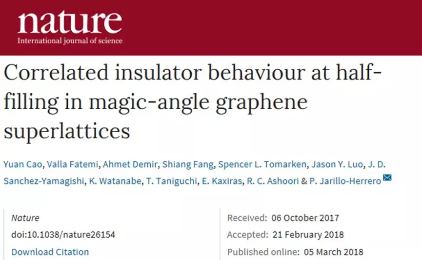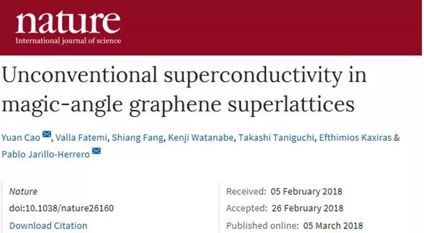 2018年3月5日,國(guó)際頂尖期刊Nature連刊兩文,以背靠背長(zhǎng)文形式在網(wǎng)站刊登了麻省理工學(xué)院Jarillo-Herrero教授課題組墨烯超導(dǎo)重大發(fā)現(xiàn)。此外,Nature在網(wǎng)站還配以Eugene J. Mele的評(píng)述。