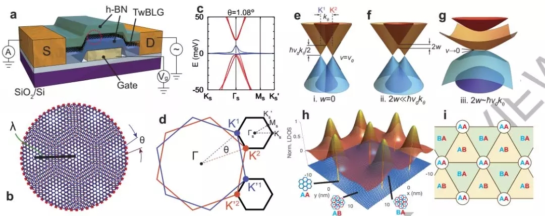 對(duì)于結(jié)構(gòu)高度有序的單層石墨烯而言,電學(xué)性能取決于對(duì)稱性。研究人員制備了旋轉(zhuǎn)扭曲的雙層石墨烯,通過電子之間的相互作用來控制整個(gè)體系的電子態(tài)。旋轉(zhuǎn)產(chǎn)生的位錯(cuò)使石墨烯層中的電子能帶結(jié)構(gòu)不再對(duì)齊,單胞變大。