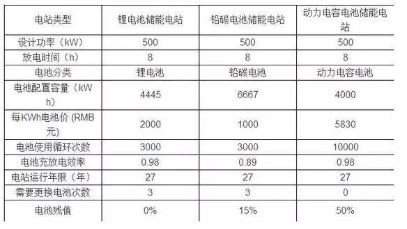 以三種不同電池,按照500kW-8h(4000kWh)儲(chǔ)能電站,分別比較儲(chǔ)能電站成本與效益。見(jiàn)下表1~表2。表1 三種不同電池儲(chǔ)能電站參數(shù)表對(duì)表1的參數(shù)