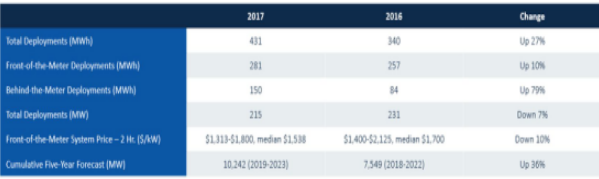 •美國2017年第四季度部署了100兆瓦時的并網(wǎng)存儲項目。