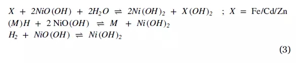 鎳基電池利用氫氧化鎳作為正極,負(fù)極材料。根據(jù)有多種。根據(jù)負(fù)極材料額種類不同,鎳基電池可以分為:鎳-鐵,鎳-鎘,鎳-鋅,鎳氫,和Ni-H2 [3,14,30,45,62] 。通常,在鎳基電池中,活性材料羥基氧化鎳作為正極,氫氧化鉀作為電解質(zhì),金屬Fe/Cd/Zn,MH或H2 材料作為負(fù)極 [14]。發(fā)生在鎳基電池中的整體電化學(xué)反應(yīng)式(3):
