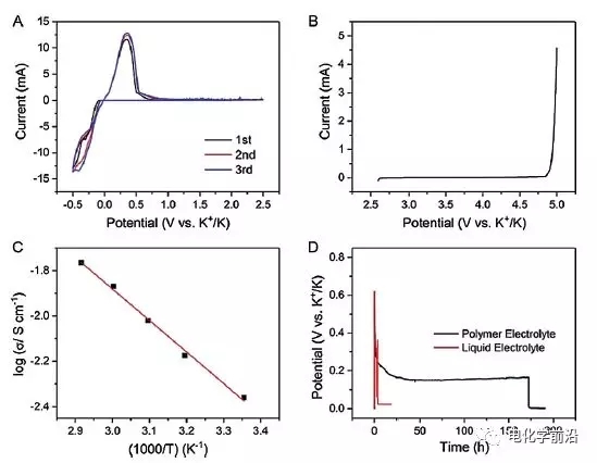 同時為抑制鉀枝晶的生成,研究人員引入交聯(lián)型PMMA為基礎的凝膠聚合物電解質(zhì),該復合電解質(zhì)可以耐受4.9V的高壓,離子電導率為4.3×10−3  S/cm,活化能僅為0.27eV。對稱電池測試,該凝膠聚合物電解質(zhì)可連續(xù)正常工作172.3h,而普通電解液僅能維持2.2h,對枝晶的抑制效果明顯。