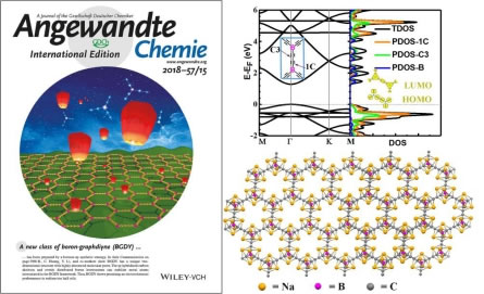 該研究組研發(fā)、制備了一類新型的硼代石墨炔,并通過理論計算與器件性能表征相結(jié)合的方式對其能帶結(jié)構(gòu)、電化學(xué)性能及儲鈉機(jī)制進(jìn)行深入分析。通過理論計算,研究了硼代石墨炔材料的能級在炔鍵(sp碳)與中心雜原子(B)上的分布情況,并進(jìn)一步分析該類材料能級結(jié)構(gòu)與在實驗中所展現(xiàn)的輸運性能之間的關(guān)系。通過對硼代石墨炔雙層排列構(gòu)型的理論分析結(jié)果與實驗中獲得XRD散射角及分子孔道孔徑與分布情況相結(jié)合,探討了硼代石墨炔分子結(jié)構(gòu)與分子平面堆積方式,以及孔徑結(jié)構(gòu)之間的內(nèi)在聯(lián)系。研究發(fā)現(xiàn),硼代石墨炔對鈉原子特殊的化學(xué)吸附作用,可以獲得極高的理論儲鈉容量。器件測試結(jié)果也證實以硼代石墨炔為電極材料的鈉離子電池,具有優(yōu)異的綜合性能,充分顯示了該類材料在鈉離子電池器件中具備很強(qiáng)的應(yīng)用潛力,開創(chuàng)了新型儲能器件電極材料研究的新方向。相關(guān)研究成果被選為VIP文章發(fā)表在《德國應(yīng)用化學(xué)》上。