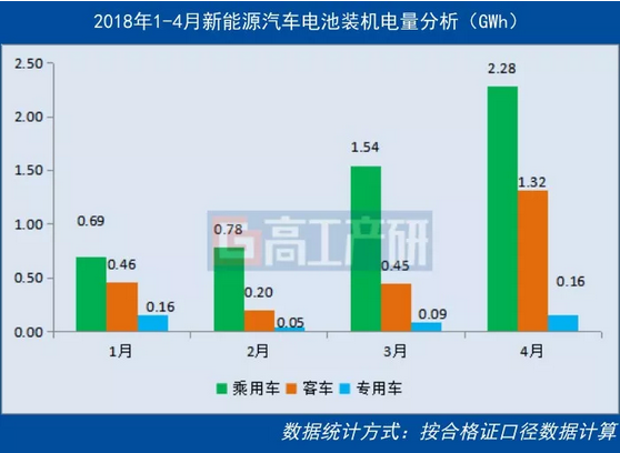 高工產(chǎn)業(yè)研究院(GGII)最新數(shù)據(jù)統(tǒng)計顯示,2018年4月我國新能源汽車生產(chǎn)約8 7萬輛,同比增長148%,動力電池裝機總電量約3 76GWh,同比增長304%。
