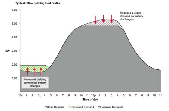 管理典型大型辦公樓的非重合需量電費(fèi)意味著在清晨為電池充電,以減少電網(wǎng)消耗。