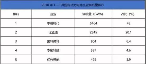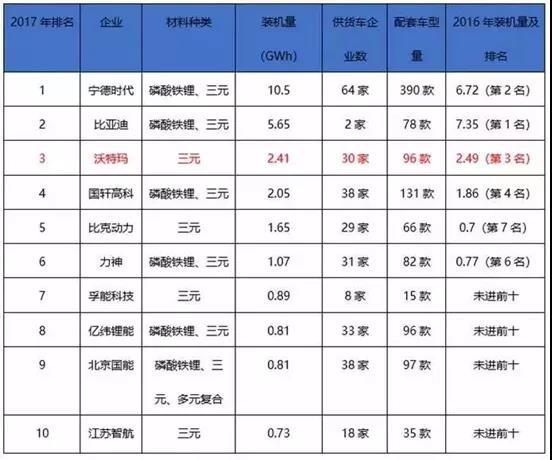 根據(jù)資料統(tǒng)計(jì),占據(jù)2017年國(guó)內(nèi)動(dòng)力電池裝機(jī)量排行榜前三的是,寧德時(shí)代、比亞迪和沃特瑪三大企業(yè),具體情況如下表: