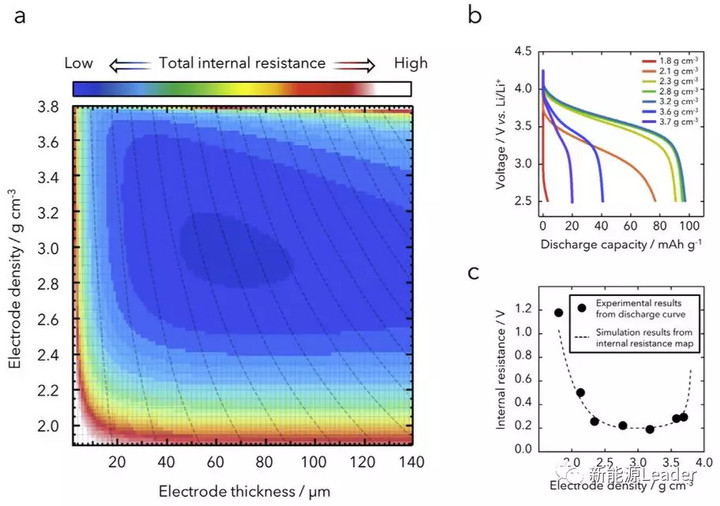 單純的做到高倍率性能并不難,難就難在倍率性能與能量密度的兼顧,一般而言倍率性能和能量密度之間是相互矛盾的,在兩者之間找到一個(gè)平衡是非常困難的,日本東京農(nóng)工大學(xué)的Kazuaki Kisu等【7】通過分析不同涂布厚度和壓實(shí)密度的NCM電極的阻抗的方式得到了最佳的涂布厚度和壓實(shí)密度的組合(70um和2.9g/cm3),在壓實(shí)密度過高時(shí)會(huì)導(dǎo)致電極孔隙率急劇下降,導(dǎo)致離子擴(kuò)散阻抗增加,而壓實(shí)密度較低時(shí)又會(huì)導(dǎo)致接觸阻抗的增加,因此只有合適的壓實(shí)密度才能在保證鋰離子電池優(yōu)異的倍率性能的同時(shí)也兼顧了高能量密度的特性。