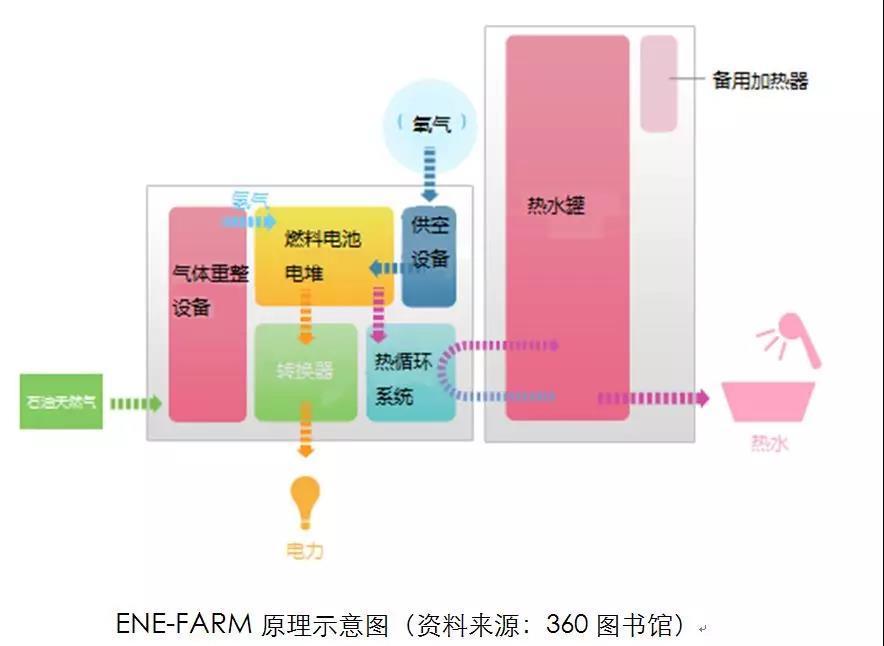 日本家用熱電聯(lián)產(chǎn)系統(tǒng)ENE-FARM是一種燃料電池在家庭中高效利用的能源系統(tǒng)。它通用天然氣重整制取氫氣,再將氫氣注入燃料電池中發(fā)電,同時(shí)用發(fā)電時(shí)產(chǎn)生的熱能來供應(yīng)暖氣和熱水,整體能源效率可達(dá)90%。