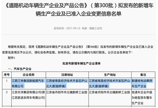 此次江西江鈴集團(tuán)新能源汽車(chē)有限公司(簡(jiǎn)稱“江鈴新能源”)進(jìn)入擬發(fā)布新增車(chē)輛生產(chǎn)企業(yè)清單。公示截止到9月21日,如果屆時(shí)沒(méi)有變化,江鈴新能源將是繼北汽新能源、云度新能源之后,第三張新建新能源汽車(chē)資質(zhì)獲得者。