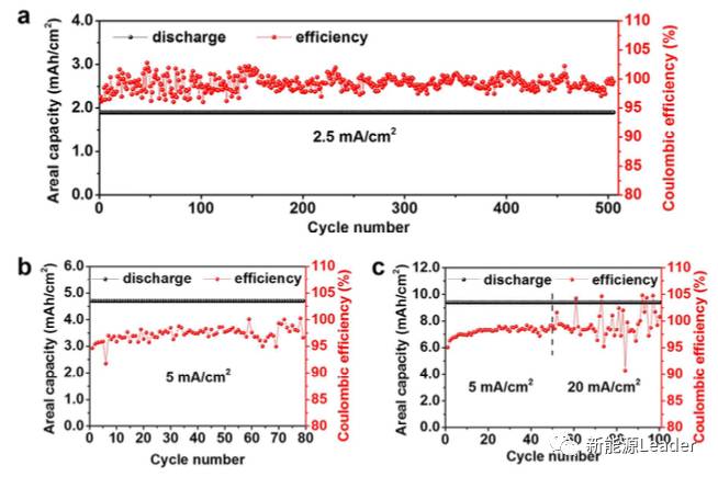 通過(guò)提高Li的負(fù)載量可以有效的提高負(fù)極的面容量密度,下圖a為L(zhǎng)i:C=1:5,比容量為643mAh/g,圖b為1:2,比容量為1287mAh/g,圖c為1:1,比容量為1930mAh/g,從圖上可以看到提高Li負(fù)載量后,多孔碳Asp-GNRs材料仍然保持了很高的庫(kù)倫效率和循環(huán)性能。