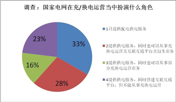 33%的調(diào)查者認(rèn)為,國家電網(wǎng)應(yīng)當(dāng)只提供配電供電服務(wù);另外,有23%的被調(diào)查者認(rèn)為,國家電網(wǎng)在提供供電配電服務(wù)的同時,可以搭建互聯(lián)互通平臺,但不應(yīng)該從事充換電運營。兩者相加,等于有56%的被調(diào)查者認(rèn)為國家電網(wǎng)不應(yīng)該從事充換電運營。