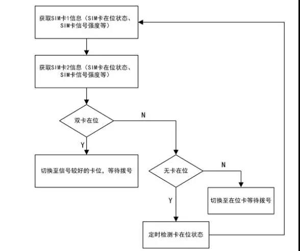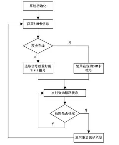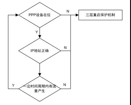 其中,判斷SIM卡在位狀態(tài)為兩層測(cè)試,兩次獲取失敗才會(huì)判定為不在位,如果在位,則挑選通信質(zhì)量較好的SIM卡進(jìn)行撥號(hào),然后進(jìn)一步通過“PPP設(shè)備是否在位、IP地址是否正確、周期內(nèi)是否產(chǎn)生流量”判斷鏈路穩(wěn)定質(zhì)量,如果不穩(wěn)定則需重啟設(shè)備。