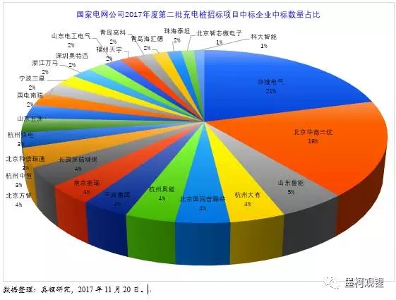 圖表 12:國(guó)家電網(wǎng)公司2017年度第二批充電樁招標(biāo)項(xiàng)目中標(biāo)企業(yè)中標(biāo)數(shù)量占比