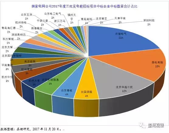 圖表 14:國(guó)家電網(wǎng)公司2017年度三批充電樁招標(biāo)項(xiàng)目中標(biāo)企業(yè)中標(biāo)數(shù)量合計(jì)占比