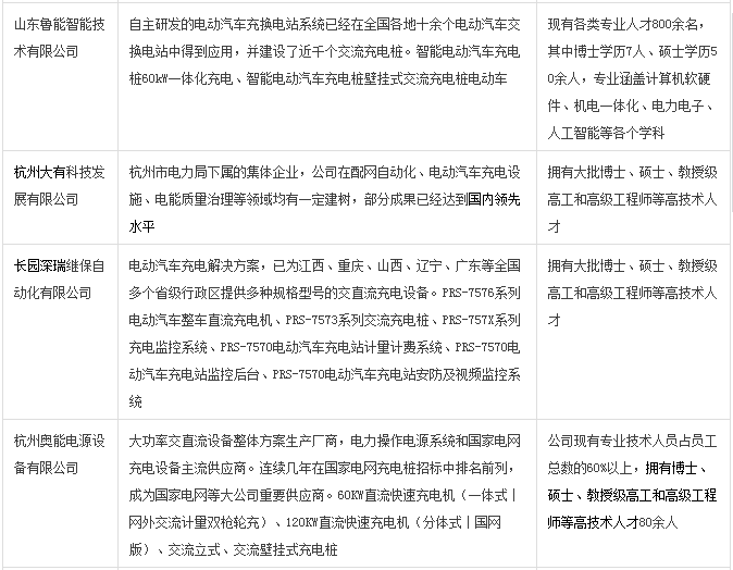 2017年前三批中標(biāo)的企業(yè)或之前曾中標(biāo)充電樁項(xiàng)目,如國(guó)電南瑞、許繼電氣、杭州奧能、南京能瑞、杭州中恒,或在全國(guó)各地有成功案例如北京華商三優(yōu)、山東魯能、長(zhǎng)園深瑞、浙江萬(wàn)馬、深圳科陸,或有完善的解決方案和超強(qiáng)的生產(chǎn)能力,如平高集團(tuán)、科大智能,或研發(fā)成果已達(dá)到國(guó)內(nèi)領(lǐng)先水平,如杭州大有、北京國(guó)網(wǎng)普瑞特、深圳奧特迅。在人員學(xué)歷構(gòu)成上,這些企業(yè)的共同點(diǎn)是本科以上學(xué)歷的專業(yè)技術(shù)人員占員工總數(shù)的60%以上,都擁有博士、碩士、教授級(jí)高工和高級(jí)工程師等高級(jí)技術(shù)人才。