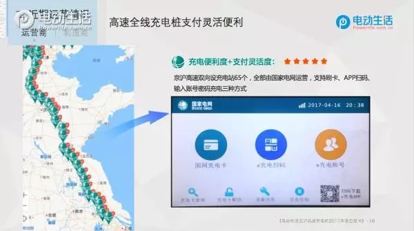京滬高速雙方向共設(shè)65個充電站,全部為國家電網(wǎng)運(yùn)營,目前支持刷卡、APP掃碼、輸入賬號密碼充電三種方式,使用起來比較方便也比較靈活。