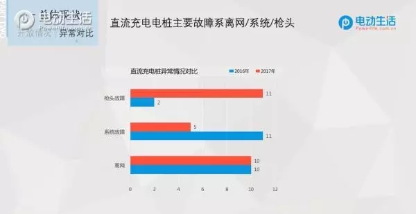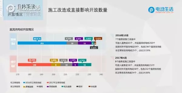 2016年10月第一次走訪時65個可進(jìn)入服務(wù)區(qū)共設(shè)260個直流充電樁,除6個因施工占用或未通電啟用的充電站以外,實(shí)際開放的59個充電站中共有236個直流快充樁。這其中離網(wǎng)10臺,系統(tǒng)故障11臺,槍頭故障2臺,損壞1臺,未結(jié)算1臺,共計(jì)有25臺電樁出現(xiàn)異常狀況占比10.59%。2017年04月第二次走訪時,有8個服務(wù)區(qū)存在施工占用的情況,實(shí)際開放的58個服務(wù)區(qū)中共有232臺直流快充樁。這其中,因屏幕故障的8臺,離網(wǎng)10臺,系統(tǒng)故障5臺,槍頭故障11臺,共有34臺電樁出現(xiàn)了異常狀況占比14.66%。