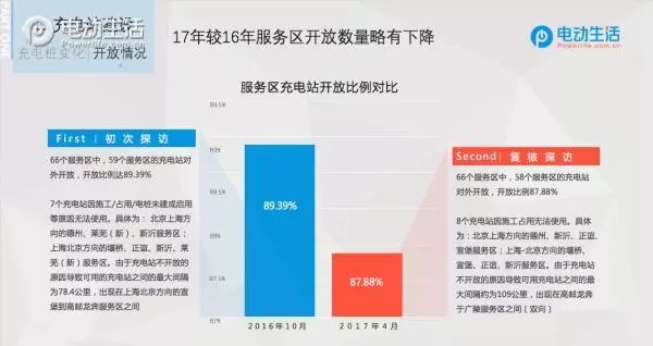 2016年10月初次探訪,66個服務(wù)區(qū)中有59個服務(wù)區(qū)的充電站對外開放,開放比例達(dá)89.39%,2017年4月二次探訪時有58個服務(wù)區(qū)的充電站對外開放,開放比例為87.88%,略有下降。
