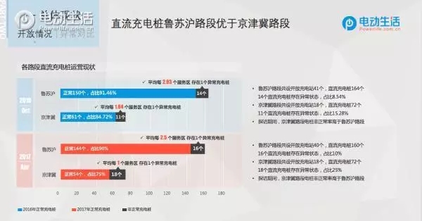 二次調(diào)研的數(shù)據(jù)顯示,京津冀路段共設(shè)18個開放充電站,共72個直流充電樁,其中18臺直流充電樁出現(xiàn)異常狀態(tài)占比25%。魯蘇滬路段共設(shè)40個開放的充電站,共160個直流充電樁,其中16個直流充電樁出現(xiàn)異常狀態(tài)占比10%??梢?,京津冀路段的電樁非正常率要高于魯蘇滬路段。