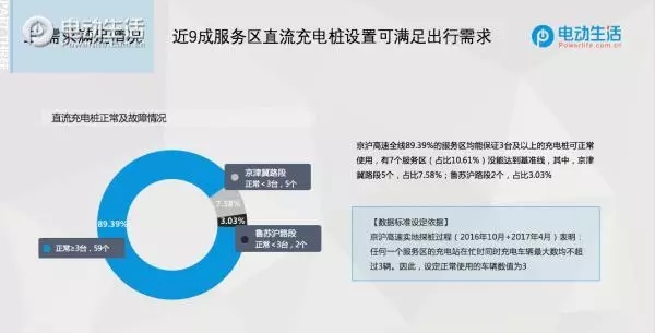 雖然北京和上海都是新能源車試點推廣城市,但是我們在實際走訪時發(fā)現(xiàn),連接兩個城市之間的京滬高速的所有充電站中,同時充電的車輛最多時也不超過3輛。那如果以3臺正常電樁才能滿足充電需求的標準來衡量,將有7個(占比12.07%)服務區(qū)沒能達到標準,其中京津冀路段占5個,魯蘇滬路段為2個。