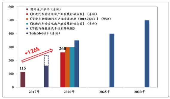 鼓勵動力電池向高能量密度技術(shù)方向發(fā)展:2017 年3 月發(fā)布的《促進汽車動力電池產(chǎn)業(yè)發(fā)展行動方案》,明確了到2020 年的目標是動力電池單體比能量超過300Wh/kg,系統(tǒng)比能量力爭達到260Wh/kg。我國目前的動力電池系統(tǒng)比能量平均水平約為115Wh/kg,不260Wh/kg 的目標值仌有較大差距。因此,不斷更新電池技術(shù),提升電池能量密度,將會是動力電池企業(yè)的核心競爭力。