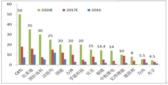近兩年動力電池企業(yè)紛紛快速擴張產(chǎn)能。政策方面,國家頒布的《促進汽車動力電池產(chǎn)業(yè)發(fā)展行動方案》(2017.3)明確要求到2020 年動力電池行業(yè)總產(chǎn)能超過1000 億瓦時,形成產(chǎn)銷規(guī)模在400 億瓦時以上、具有國際競爭力的龍頭企業(yè)。2016 年新能源車產(chǎn)銷量約52 萬輛,同比增長約52%,對應(yīng)動力電池需求約為28.3GWh;2017 年新能源汽車產(chǎn)銷量估計可實現(xiàn)70 萬輛以上(同比增長35%以上),則動力電池總需求量預計將達34.0GWh(同比增長約20%); 如按國家規(guī)劃目標2020 年新能源汽車產(chǎn)銷量200 萬輛,預計2020 年動力電池市場總需求為124.3GWh,相當二2016 年的4.4 倍。假設(shè)按平均1.0 元/Wh 進行測算,2020 年國內(nèi)車用動力鋰電池市場規(guī)模約為1243億元,為2016 年的2.1 倍左右。