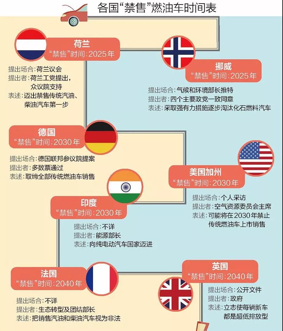 禁售燃油車,不僅是中國,而在全球各國也早已積極行動,特別是一些歐洲發(fā)達國家,早已公布燃燒汽車禁售的時間表。比如英國、美國、法國等,這些國家的燃油車禁售時間均沒有超過2040年。雖然我國還沒有發(fā)布準確的燃油車禁售時間,但是工信部已經(jīng)開始研究,并且大致確定禁售時間。
