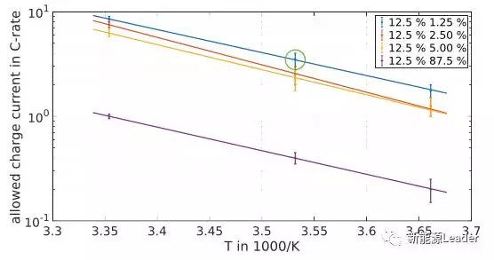 下圖為SoC為12.5%的電池,不同的充電量下(1.25%、2.5%、5%和87.5%),最大電流與環(huán)境溫度的關(guān)系,從圖上可以看到,充電量越多,則最大充電電流越小,溫度越低,充電電流越小。同時(shí)我們注意到,雖然四條曲線雖然電流差異很大,但是幾條曲線的斜率基本上是一致的。