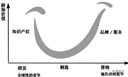 微笑嘴型的一條曲線,兩端朝上,在產(chǎn)業(yè)鏈中,附加值更多體現(xiàn)在兩端,設(shè)計(jì)和銷售,處于中間環(huán)節(jié)的制造附加值最低。微笑曲線中間是制造;左邊是研發(fā),屬于全球性的競爭;右邊是營銷,主要是當(dāng)?shù)匦缘母偁?。?dāng)前制造產(chǎn)生的利潤低,全球制造也已供過于求,但是研發(fā)與營銷的附加價值高,因此產(chǎn)業(yè)未來應(yīng)朝微笑曲線的兩端發(fā)展,也就是在左邊加強(qiáng)研展創(chuàng)造智慧財(cái)產(chǎn)權(quán),在右邊加強(qiáng) 客戶導(dǎo)向的營銷與服務(wù)。