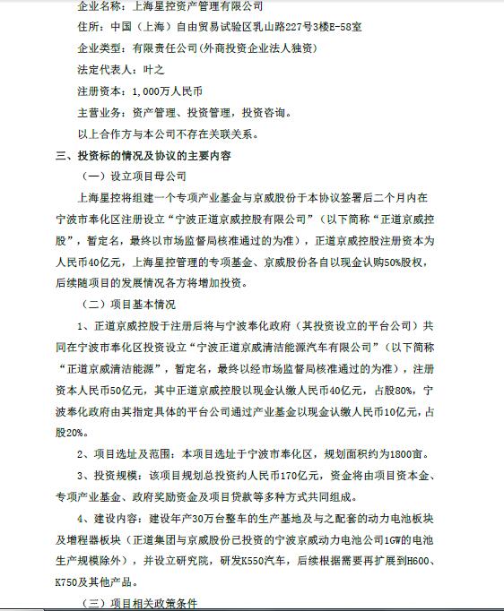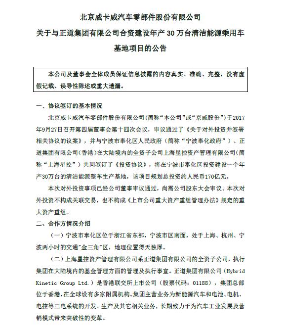 9月29日,北京威卡威汽車零部件股份有限公司(簡稱“京威股份”)官方網(wǎng)站發(fā)布公告稱,公司于2017年9月27日召開第四屆董事會(huì)第十四次會(huì)議,審議通過了《關(guān)于對外投資并簽署相關(guān)協(xié)議的議案》,并與寧波市奉化區(qū)人民政府、正道集團(tuán)有限公司(香港)在大陸境內(nèi)的全資子公司上海星控資產(chǎn)管理有限公司(簡稱“上海星控”)共同簽訂了《投資協(xié)議》,將在寧波市奉化區(qū)投資建設(shè)一個(gè)年產(chǎn)30萬臺(tái)的清潔能源整車生產(chǎn)基地,該項(xiàng)目規(guī)劃總投資約人民幣170億元,規(guī)劃用地約1800畝。