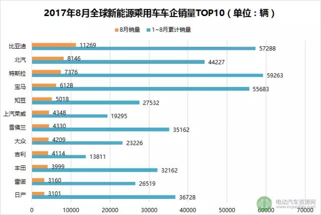 2017年1-8月全球新能源乘用累計銷量排在前十的車企分別為:特斯拉(59263臺)、比亞迪(57288臺)、寶馬(55683臺)、北汽(44227臺)、日產(chǎn)(36728臺)、雪佛蘭(35162臺)、豐田(32162臺)、知豆(27532臺)、雷諾(26519臺)、大眾(23226臺)。
