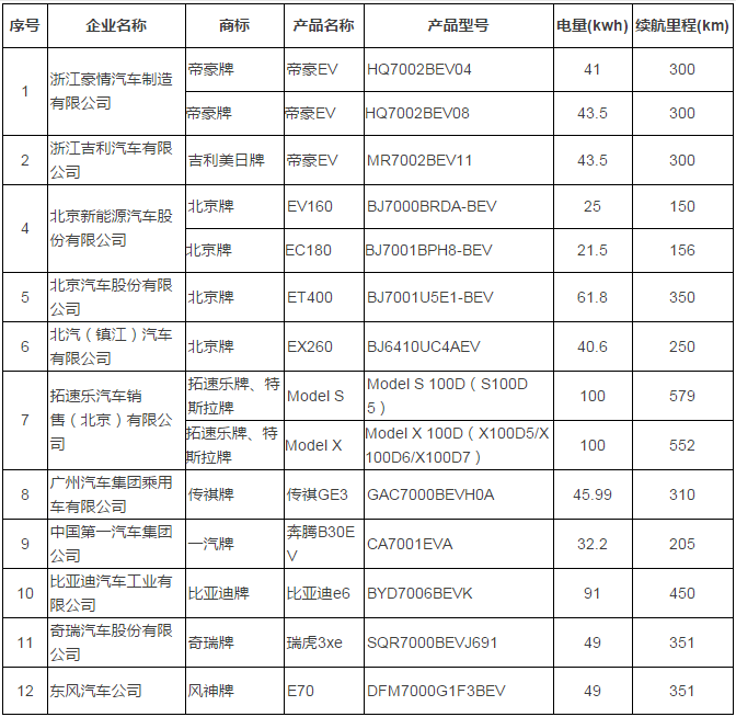北京市10月13日發(fā)布2017年第5批示范應(yīng)用純電動小客車生產(chǎn)企業(yè)及產(chǎn)品備案目錄,浙江豪情汽車、廣汽、一汽進(jìn)入備案目錄。進(jìn)入備案的具體車型有帝豪EV(3款)、北汽EV160 EC180 ET400 EX260、Model S Model X、傳祺