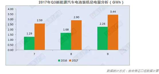 高工產(chǎn)研鋰電研究所(GGII)發(fā)布《新能源汽車產(chǎn)業(yè)鏈數(shù)據(jù)庫》統(tǒng)計(jì)顯示,2017年Q3動(dòng)力電池裝機(jī)總電量約8.9GWh,同比增長71%。