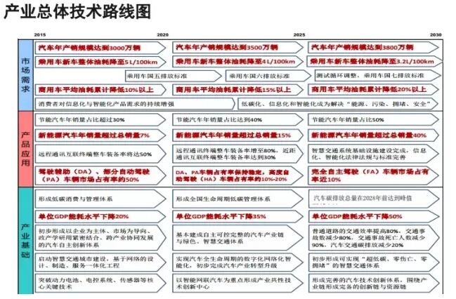 本次發(fā)布的路線圖為“1+7”,主要包括:總體技術(shù)路線圖、節(jié)能汽車技術(shù)路線圖、純電動和插電式混合動力汽車技術(shù)路線圖、氫燃料電池汽車技術(shù)路線圖、智能網(wǎng)聯(lián)汽車技術(shù)路線圖、汽車制造技術(shù)路線圖、汽車動力電池技術(shù)路線圖、汽車輕量化技術(shù)路線圖。