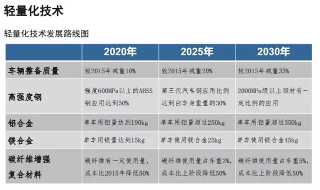 2026年-2030年為第三階段,重點發(fā)展鎂合金和碳纖維復(fù)合材料技術(shù),解決鎂合金及復(fù)合材料循環(huán)再利用問題,實現(xiàn)碳纖維復(fù)合材料混合車身及碳纖維零部件的大范圍應(yīng)用,突破復(fù)雜零件成型技術(shù)和異種零件連接技術(shù)。