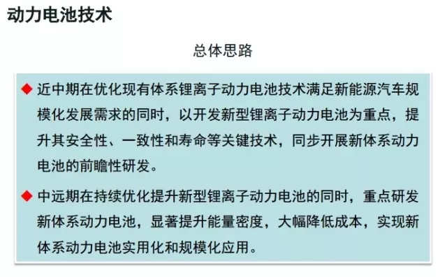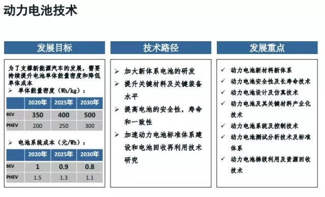 汽車動力電池技術(shù)路線以高安全,高比能,長壽命,低成本為總目標,以電池材料研發(fā)為核心,以能量型和能量功率兼顧型動力電池產(chǎn)品為重點,以先進制造技術(shù)裝備為保障,遠近結(jié)合,統(tǒng)籌推進新型鋰離子電池和新體系電池的研發(fā)和產(chǎn)業(yè)化,近期主要以提升現(xiàn)有體系電池性能為主,支撐目前新能源汽車技術(shù)快速發(fā)展,中期以開發(fā)新體系電池為主,突破核心技術(shù),遠期實現(xiàn)新體系電池的產(chǎn)業(yè)化。