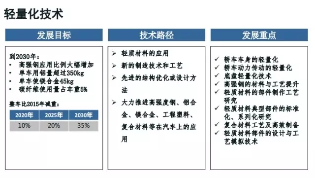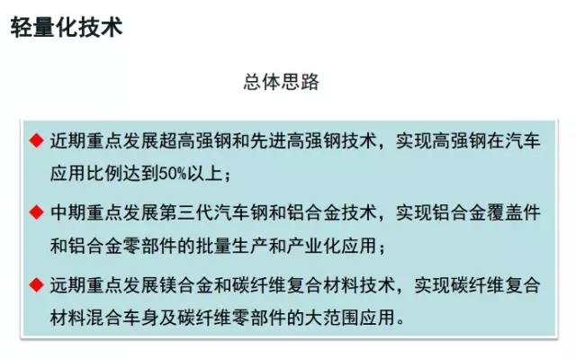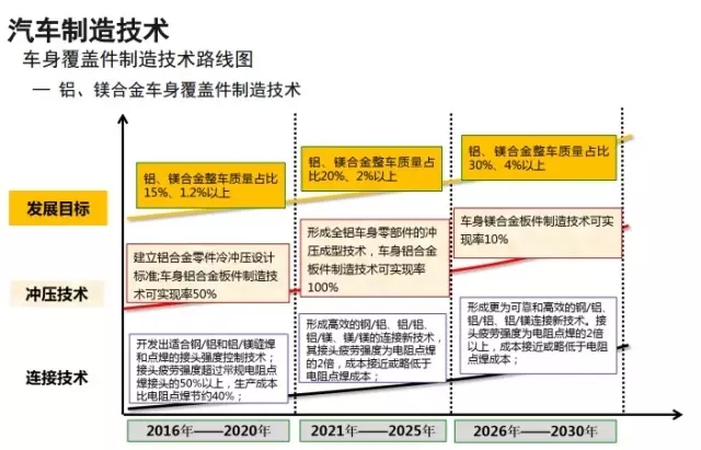 2016年-2020年為第一階段,重點發(fā)展超高強度鋼和先進高強度鋼技術(shù),包括材料性能開發(fā),輕量化設(shè)計方法,成型技術(shù),焊接工藝和測試評價方法等,實現(xiàn)高強度鋼在汽車應(yīng)用比例達到50%以上,開展鋁合金板材沖壓制作技術(shù)研究并在車身實踐,研究不同材料的連接技術(shù)。