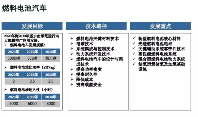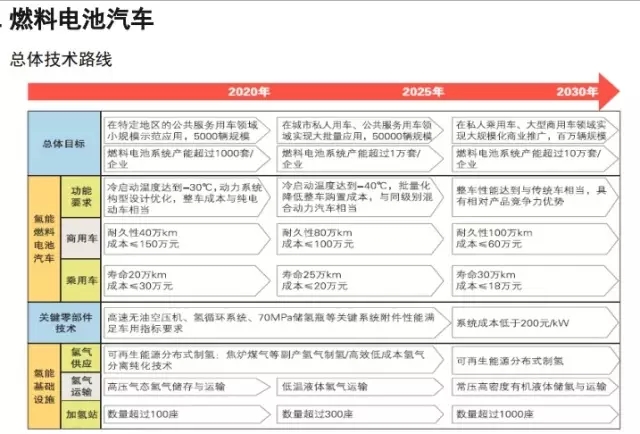 氫燃料電池汽車技術(shù)路線以實現(xiàn)氫燃料電池汽車產(chǎn)業(yè)化為目標,開展燃料電池系統(tǒng)、燃料電池堆及材料、車載儲氫與加氫站等關(guān)鍵產(chǎn)業(yè)環(huán)節(jié)技術(shù)與產(chǎn)品攻關(guān)、突破核心技術(shù)、提高性能并進一步減低成本,建立并完善燃料電池關(guān)鍵技術(shù)及產(chǎn)業(yè)鏈,燃料電池乘用車與商用車具有較強市場競爭力并實現(xiàn)全面產(chǎn)業(yè)化。